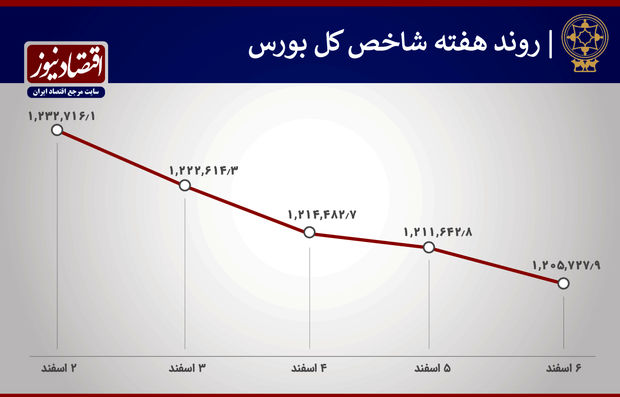 شاخص کل در آخرین روز هفته 5 هزار و 915 واحد افت کرد و به رقم یک میلیون و 205 هزار واحد رسید که نسبت به آخرین روز معاملاتی هفته قبل 32 هزار و 630 واحد پائینتر ایستاد تا بازدهی هفته شاخص بورس منفی 2.63 درصد شود. در هفته اخیر روند تغییرات شاخص کل در تمام روزهای هفته نزولی بود و شاخص کل هشت روز نزولی پیاپی را ثبت کرد.