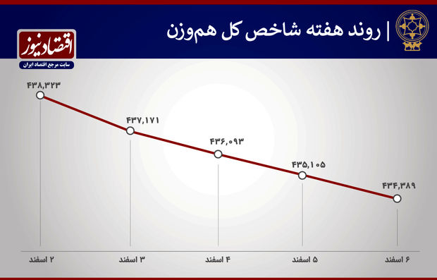 شاخص کل هموزن نیز در تمام روزهای هفته اخیر نزولی بود. شاخص هم وزن در پایان هفته نسبت به هفته پیشین 4 هزار و 568 واحد پائینتر ایستاد و به رقم 434 هزار و 389 واحد رسید و بازدهی منفی 0.13 درصدی را ثبت کرد.