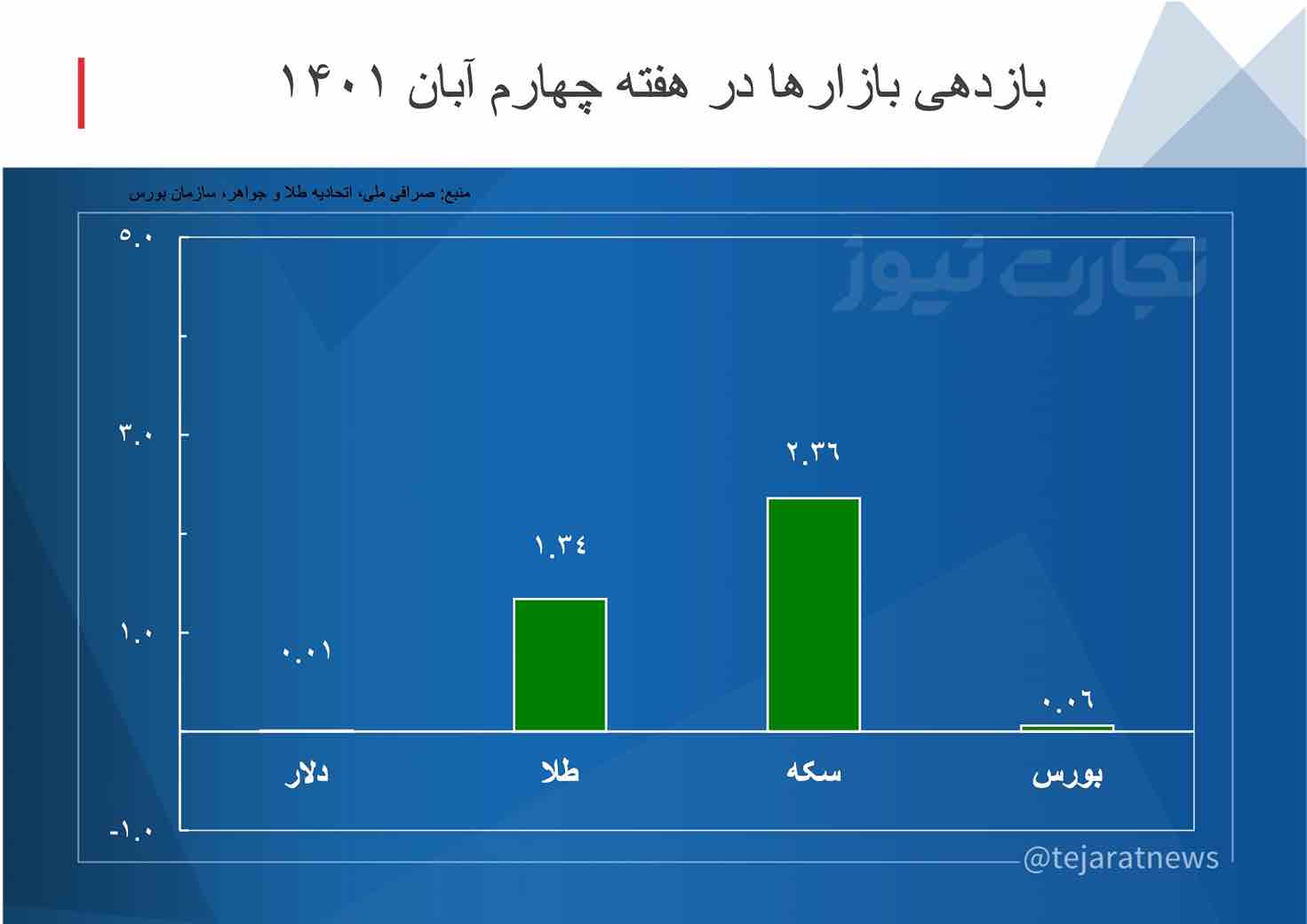 بازدهی بازار طلا نیز در چهارمین هفته آبان ماه با ۱۹ هزار و ۶۰۰ تومان تغییر قیمت، رشدی در حدود ۱/۳۴ درصدی داشت. این در حالی است که در سومین هفته آبان طلا رشد ۵/۲۴ درصدی داشت.