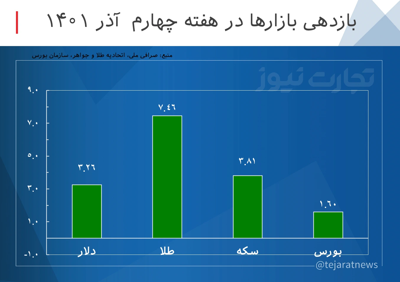 در آخرین هفته از آذر ۱۴۰۱ بازدهی تمامی بازارهای سرمایه مثبت بود. بیشترین بازدهی مربوط به طلا با ۷.۴۴ درصد رشد است. در مرحله بعد سکه و دلار قرار داشتند.