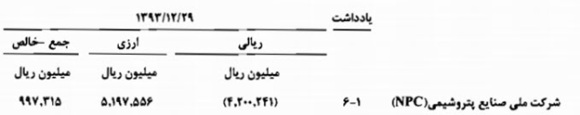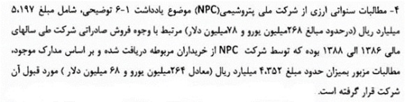 (مبلغ 268 میلیون یورو و 78 میلیون دلار با نرخ ارز مرجع همانطور که اشاره شد در حسابهای دریافتنی زاگرس معادل 5197 میلیارد ريال منعکس شده و 4170 میلیارد ريال بدهی ريالی در سال 92 نیز معادل 4201 میلیارد ريال سال 93 است)