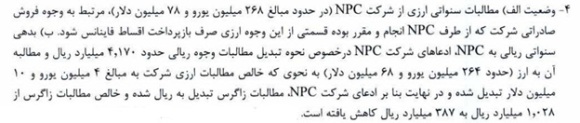 مطالبات سنواتي ارزي زاگرس از NPC در حدود 268 ميليون يورو و 78 ميليون دلار، مرتبط با وجوه ارزی فروش صادراتي زاگرس طي سالهاي مالي 1386 الي 1388 بوده که توسط شرکت بازرگانی پتروشیمی از خريداران مربوطه دریافت و در اختیار NPC قرار گرفته است. طبق قرارداد سه جانبه ای بین بانک تجارت، بانک عامل تامین کننده فاینانس زاگرس، شرکت NPC و زاگرس، مقرر بوده قسمتي از اين وجوه ارزي توسط NPC به بانک تجارت داده شود تا صرف بازپرداخت اقساط فاينانس شده و مازاد آن نیز به زاگرس پرداخت شود. اما NPC به تعهدات خود از آبان 1386 عمل نکرده است که این خود موجب محاسبه جریمه از سوی بانک تجارت برای زاگرس شده است (که در ادامه به تشریح آن خواهیم پرداخت). بند حسابرس در صورتهای مالی سال 93 زاگرس نیز در ادامه آمده است: