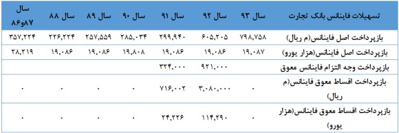 مورد سوم وضعيت بازپرداخت اقساط معوق تسهيلات فاينانس (حدود 138 ميليون يورو) به بانک تجارت است. عليرغم توافقات صورت گرفته در سال 86 که مقرر بوده قسمتي از وجوه ارزي فروش صادراتی زاگرس توسط NPC صرف بازپرداخت اقساط فاينانس بانک تجارت گردد، عدم پرداخت اقساط مربوطه توسط NPC موجب شده که زاگرس علاوه بر پرداخت مانده اصل و فرع تسهیلات، متحمل پرداخت وجه التزام و تفاوت افزایش نرخ تسویه ارز (از نرخ مرجع به ارز منشا داخل) نیز بشود. با وجود اینکه زاگرس تمام بدهی خود به بانک(اصل و فرع و جریمه) را طی سالهای 91 و 92 تسویه نموده است اما هنوز اختلاف میان زاگرس و NPC برای جبران ضرر و زیان حاصل از این مسئله پا برجاست و پیگیریهای زاگرس برای وصول مطالبات از NPC تاکنون بی نتیجه بوده است. با انجام محاسبات پیچیده میتوان دریافت که مبلغ زیان ناشی از تسعیر ارز حدود 642 میلیارد ريال بوده است. ضمنا وجه التزام اقساط مذکور 1.245 میلیارد ريال بوده است. زاگرس این مبالغ را بدلیل عدم انجام تعهدات NPC متحمل شده است. در پیوست 1، تسهیلات فاینانس بانک تجارت به مبلغ 142.736 هزار یورو و بازپرداخت آن به تشریح آمده است.