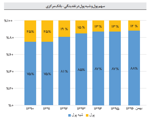 از مجموع 1489 هزار میلیارد تومان نقدینگی کشور که تا پایان بهمن سال گذشته ثبت شده است، 185 هزار میلیارد تومان به عنوان پول و مابقی به عنوان شبهپول شناخته میشود. به 185 هزار میلیارد تومان پولی که بخشی از نقدینگی است، پول سیال گفته میشود که در اختیار مردم و بانکها قرار دارد. بنابراین 12.5 درصد از مجموع نقدینگی بیشتر در معرض جابهجایی است. از این مبلغ 53 هزار و 580 میلیارد تومان در قالب اسکناس و مسکوک در اخیار مردم، بانکها و بانک مرکزی است که 36 هزار میلیارد تومان از آن در اختیار مردم است. 131 هزار میلیارد تومان از پول موجود در جامعه نیز به عنوان سپردههای دیداری نزد بانکهای تجاری، خصوصی و تخصصی قرار دارد.