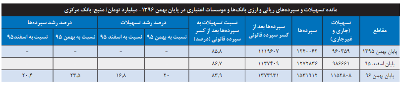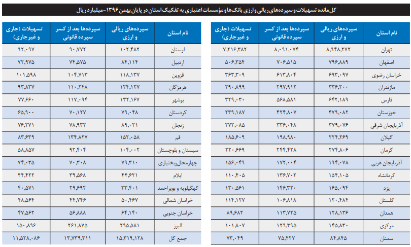مجموع سپردههای ریالی و ارزی بانکی پس از کسر سپرده قانونی معادل 1373 هزار میلیارد تومان برآورد شده است. کل تسهیلاتی که سیستم بانکی تا پایان بهمن سال 96 نزد مشتریان خود دارد، معادل 1152 هزار میلیارد تومان است که افزایش 20 درصدی نسبت به مدت مشابه سال 95 و افزایش 16.8 درصدی نسبت به اسفند سال 95 دارد. نسبت تسهیلات به سپردهها بعد از کسر سپرده قانونی 83.9 درصد برآورد شده است که این نسبت در مقایسه با بهمن 95 و اسفند 95 به ترتیب 1.9 و 2.8 درصد کاهش نشان میدهد. نسبت تسهیلات به سپردهها در تهران 89.2 درصد و در کهگیلویه و بویراحمد 136.6 درصد بوده است.