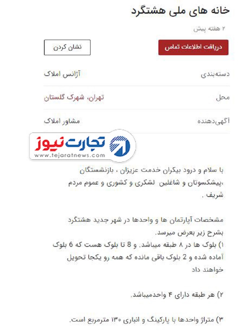 در مواردی نیز آژانسهای ملکی برای فروش تعدادی در واحدهای این دو شهر آگهی ثبت کردهاند. در یکی از این آگهیها با عنوان «خانههای ملی هشتگرد» آمده است: «مشخصات آپارتمانها و واحدها در شهر جدید هشتگرد به شرح زیر به عرض میرسد.۱- بلوک ها در ۸ طبقه است. و هشت تا بلوک هست که شش بلوک آماده شده و دو بلوک باقی مانده که همه را یک جا تحویل خواهند داد. ۲- هر طبقه دارای چهار واحد است. ۳- متراژ واحدها با پارکینگ و انباری ۱۳۰ مترمربع است. ۴- هر واحد دارای انباری و پارکینگ است. ۵- قیمت هر واحد ۲۶۰ میلیون تومان با احتساب وام و انباری و پارکینگ است. ۶- تحویل یک ساله . ۷- پرداختی در زمان ثبت نام ۷۰ میلیون تومان. ۸- چهار چک به مبلغ ۳۷ میلیون و ۵۰۰ هزار تومان در مدت یک سال توسط خریدار پرداخت خواهد شد. ۹- مبلغ ۴۰ میلیون تومان وام مسکن مهر با سود دوران مشارکت با شرایط اقساط بلندمدت که اقساط آن پس از تحویل واحدها شروع میگردد.»