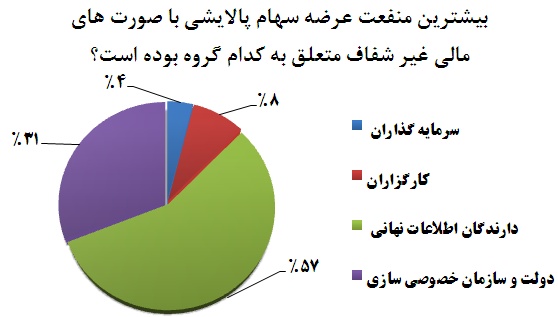 بطوریکه دارندگان اطلاعات نهانی نزدیک به 57 درصد از کل آراء را به خود اختصاص داده و دولت و سازمان خصوصی سازی نیز با کسب حدود 31 درصد از نظرات ارایه شده در جایگاه بعدی قرار گرفته است.