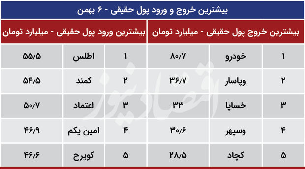 همچنین دیروز خالص ارزش تغییر مالکیت حقیقی به حقوقی 602 میلیارد تومان بود و برای دومین روز پیاپی نمادهای کوچک و متوسط بیش از بزرگان شاهد خروج پول حقیقی بودند. رقم خروج پول حقیقی از نمادهای کوچک و متوسط 402 میلیارد تومان و رقم خروج نقدینگی حقیقی از نمادهای بزرگ بازار 200 میلیارد تومان بود.