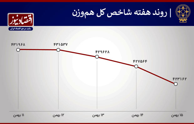 شاخص کل هموزن نیز در مجموع هفته اخیر کاهش یافت و در تمامی روزهای هفته شاهد افت رقم شاخص هموزن بودیم. شاخص در پایان هفته نسبت به هفته پیشین هزار و 461 واحد پایینتر ایستاد و به رقم 423 هزار و 162 واحد رسید و بازدهی منفی 0.34 درصدی را ثبت کرد. با این حال روند تغییرات هفتگی شاخص هموزن نسبت به افت 1.94 درصدی هفته پیشین بهبود یافته است.