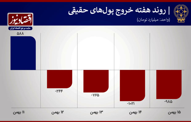 علاوه بر این، به استثنای روز شنبه در باقی روزهای هفته گذشته شاهد خروج پول حقیقی از بورس بودیم. در مجموع کل هفته، 2 هزار و 427 میلیارد تومان پول حقیقی از بورس خارج شد و میانگین هفته خروج پول حقیقی 485 میلیارد تومان بود که نسبت به هفته پیشین رشد 6 درصدی داشته است.