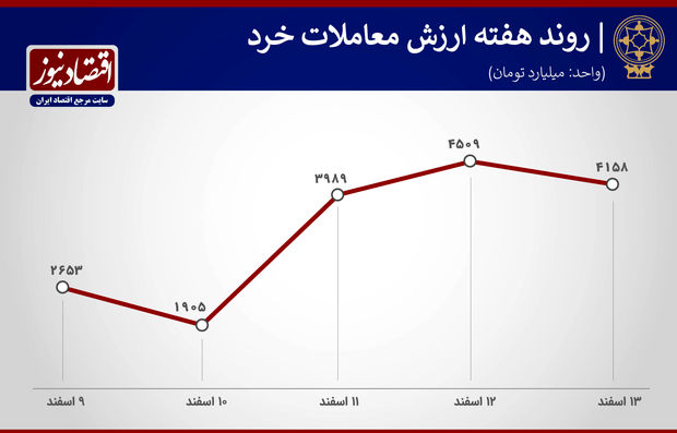 در هفته اخیر علاوه بر نزول شاخصهای تابلوی بورس، دیگر نماگرهای بازار سهام نیز نشان از وضعیت نامطلوب بازار دارند. در این هفته نقدشوندگی بازار به حداقلیترین رقم تاریخی خود رسید به طوری که در روز یکشنبه ارزش معاملات خرد به رقم هزار و 905 میلیارد تومان رسید که کمترین رقم در کل سال 1399 بود. میانگین ارزش معاملات خرد در هفته اخیر 3 هزار و 442 میلیارد تومان بود که نسبت به رقم 4 هزار و 30 میلیاردی هفته پیشین، افت 14 درصدی داشته است. بالاترین رقم هفته 4 هزار و 509 میلیارد تومان بود که در روز سهشنبه ثبت شد و پایینترین رقم به روز یکشنبه برمیگردد که هزار و 905 میلیارد تومان بود.