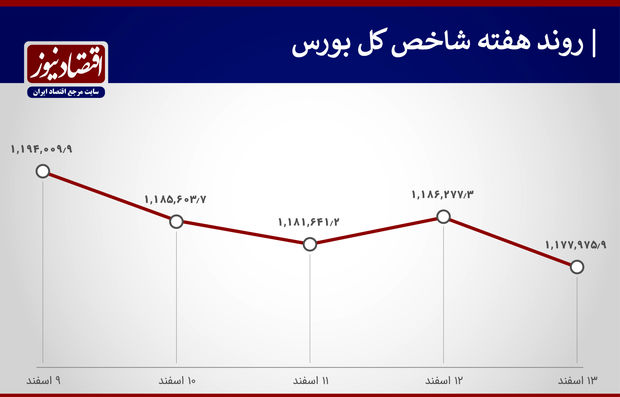شاخص کل در آخرین روز هفته 8 هزار و 301 واحد افت کرد و به رقم یک میلیون و 177 هزار واحد رسید که نسبت به آخرین روز معاملاتی هفته قبل 27 هزار و 857 واحد پائینتر ایستاد تا بازدهی هفته شاخص بورس منفی 2.3 درصد شود. در هفته اخیر روند تغییرات شاخص کل تنها در روز سهشنبه صعودی بود که شاخص کل پس از 11 روز کاری صعودی شد.