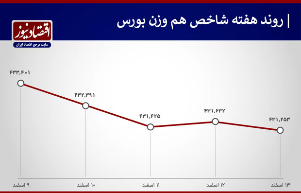 شاخص کل هموزن نیز به استثنای روز سهشنبه در باقی روزهای هفته اخیر نزولی بود. شاخص هم وزن در پایان هفته نسبت به هفته پیشین 3 هزار و 143 واحد پائینتر ایستاد و به رقم 431 هزار و 253 واحد رسید و بازدهی منفی 0.72 درصدی را ثبت کرد.
