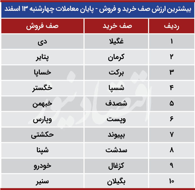 در آخرین روز کاری هفته بیشترین صف فروش نیز به دی (بانک دی) تعلق داشت که در پایان معاملات صف فروش 111 میلیارد تومانی داشت. پس از دی، پتایر (شرکت ایران تایر) و خساپا (سایپا) بیشترین صف فروش را داشتند.