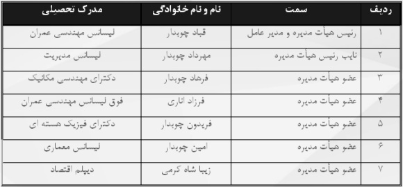 همچنین اسامی شش عضو هیأت مدیره این شرکت پیمانکار بخش خصوصی فعال در حوزه راه و ساختمان یعنی خانواده چوبدار که در جدول زیر نیز مشخص است، در این فهرست جای دارد و معلوم نیست که آیا در صورت تأیید صلاحیت فنی و تخصصی شرکت مذکور برای اداره صدرا، این افراد از صلاحیت و اهلیت مالی لازم نیز برخوردارند؟