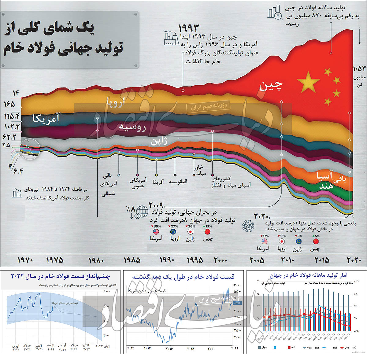از عصر برنز تا عصر آهن، فلزات دورههایی از تاریخ بشر را مشخص کردهاند. اگر قرار بود دوران کنونی ما به همین شکل تعریف شود، بدونشک بهعنوان عصر فولاد شناخته میشد. فولاد شالوده ساختمانها، وسایل نقلیه و صنایع ما است و میزان تولید و مصرف آن اغلب بهعنوان نشانگر توسعه یک کشور تلقی میشود. امروزه با تولید 1864میلیون تن فولاد خام در سال2020، اینفلز متداولترین فلز مورداستفاده و بازیافتیترین ماده در جهان است. بررسی دادههای انجمن جهانی فولاد در 50سال اخیر نشان میدهد روند تولید فولاد خام به شکلی بوده است که رشد بیوقفه استحصال و عرضه این فلز، رشد و توسعه جهان را طی نیمقرن اخیر یادآور میشود. بهطور دقیقتر، تولید جهانی فولاد طی 50سال گذشته بیش از سهبرابر شده است، بهرغم اینکه کشورهایی مانند ایالاتمتحده و روسیه تولید داخلی خود را کاهش داده و بیشتر به واردات متکی هستند اما هم تعداد تولیدکنندگان و هم حجم تولید بهشدت افزایش یافته است. در این مسیر، چین و هند بهطور مداوم تولید خود را افزایش دادهاند تا به دو کشور برتر تولیدکننده فولاد تبدیل شوند. طبق اعلام انجمن جهانی فولاد، برترین کشورهای تولیدکننده فولاد خام جهان تا سال2020 به ترتیب چین، هند، ژاپن، روسیه، ایالاتمتحده آمریکا، کرهجنوبی، ترکیه، آلمان، برزیل و ایران بودهاند. این 10بازیگر به تنهایی تولیدکننده 1587میلیون تن فولاد هستند و مالک 85درصد از کل این صنعت بزرگ هستند.