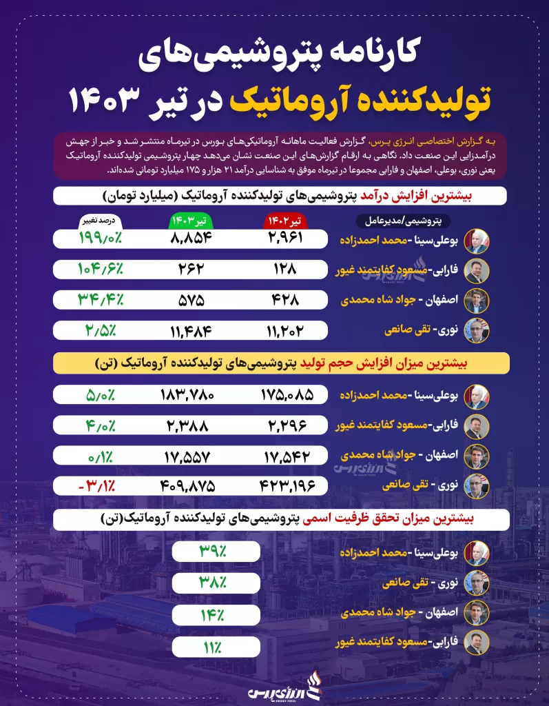 بررسی و مقایسه گزارش فعالیت ماهانه پتروشیمیهای تولیدکننده آروماتیک در تیرماه امسال نشان میدهد، تمامی پتروشیمیهای این صنعت موفق به افزایش درآمد تیرماه خود شدهاند. در این میان دو پتروشیمی بوعلی سینا و فارابی بهتر از سایر رقبا عمل کردند و جهش چشمگیری را در درآمد ماهانه خود رقم زدند.