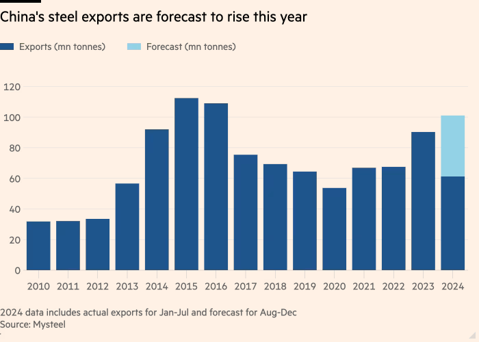 بر اساس آمارهای تجاری ارائه شده از وب سایت چینی معتبر «مای استیل»، میزان عرضه فولاد این کشور به بازارهای جهانی، سقف ۸ ساله خود را شکسته است. انتظار می رود میزان صادرات بزرگترین تولید کننده فولاد جهان در سال ۲۰۲۴ از ۱۰۰ میلیون تن عبور نوده که این رقم، بالاترین میزان صادرات فولاد چین از سال ۲۰۱۶ به این سو محسوب می شود. به گفته «ویویان یانگ» سردبیر وب سایت مای استیل، حتی امکان عبور حجم صادرات فولادی چین از ۱۰۱ میلیون تن تا پایان سال نیز وجود داشته که این رقم به معنای شکسته شدن سومین رکورد تاریخی چینی ها در صادرات فولاد است.