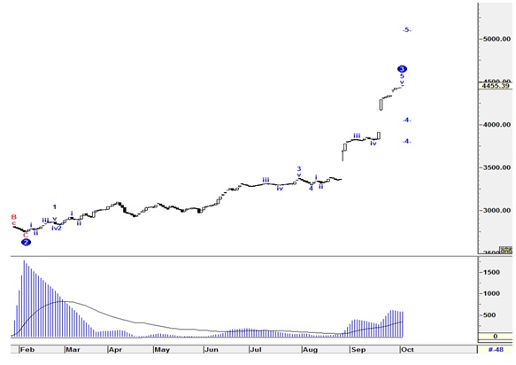 این تحلیلگر تکنیکالیست روند شاخص صنعت فلزات اساسی را در نمودارهای هفتگی بر روی موج سوم صعودی عنوان کرد که هدف آتی آن رقم 50 هزار و 50 واحدی است.