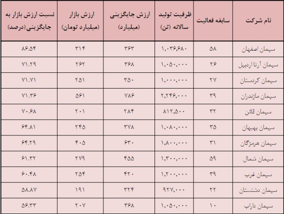 اسفندیار سالاروند با اشاره به ارزش جایگزینی یک شرکت سیمانی با ظرفیت تولید یک میلیون تن سیمان در سال گفت: در شرایط فعلی برای تأسیس یک شرکت سیمانی با ظرفیت تولیدی یک میلیون تن سیمان در سال هزینه ای معادل 100 میلیون یورو صرف خواهد شد که تسعیر این مبلغ با یوروی دولتی به مبلغ 3500 تومان، رقمی معادل 350 میلیارد تومان برآورد می گردد. بنا بر این با عنایت به مفروضات عنوان شده مطابق جدول ذیل خواهیم دید که ارزش بازاری شرکت های سیمانی فعال در بورس بسیار پایین تر از ارزش های جایگزینی آن ها قرار دارند.