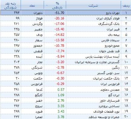 این در حالی است که در پایان جدول رتبه بندی بازدهی سهام نیز شرکت تهران دارو نزدیک به 52 درصد افت قیمت سهم را تجربه کرده تا با کاهش سرمایه سهامدارانش در انتهای این جدول جای گیرد.