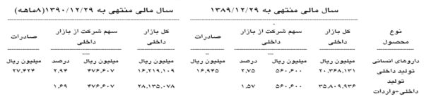 در سال مالی منتهی به 1390.12.29، معادل 1.268میلیون عدد تولید عددی از گروههای مختلف شامل آمپول، قرص، دراژه، شیاف و پماد، کرم، ژل و کپسول و ویال انجام که کلیه تعهدات به وزارت بهداشت و سازمان دامپزشکی کشور محقق گردیده است.