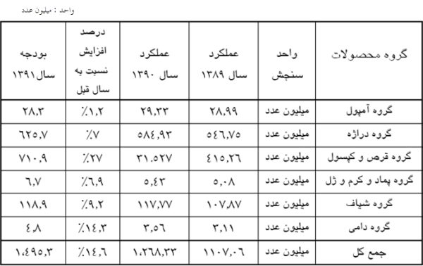 بیشترین افزایش شاخص تولید در بخش قرص و کپسول 27 درصد رشد، در بخش ویال14.3 درصد و در بخش شیاف 9.2 درصد رشد نسبت به عملکرد تولید عددی نسبت به سال گذشته بود.