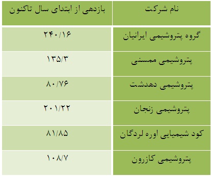 در پایان، جدول زیر بازدهی قیمتی سهام شرکت های پتروشیمی فعال در بازار پایه را از ابتدای سال جاری تاکنون نشان می دهد.