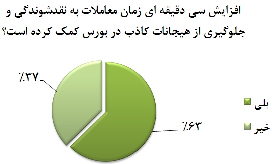 سؤال نظرسنجی بورس نیوز عبارت است از "آیا افزایش سی دقیقه ای زمان معاملات روزانه به نقدشوندگی و جلوگیری از هیجانات کاذب در بورس کمک کرده است؟"