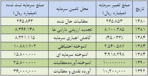 سرمایه شرکت در بدو تاسیس مبلغ ده میلیون ریال بوده که طی چند مرحله به شرح جدول زیر به مبلغ 36.000.000 میلیون ریال فزونی یافته است.