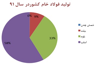 بنا بر آخرین گزارش سازمان توسعه و نوسازی معادن و صنایع معدنی ایران (ایمیدرو) از تولیدات واحدهای فولادسازی کشور در سال 1391، در مجموع بیش از 13.422 هزار تن انواع فولاد خام شامل شمش چدن، بیلت، بلوم و اسلب در این واحدها تولید شده است. در بین این محصولات اسلب با بیش از 7.823 هزار تن، بیشترین حجم تولید را به خود اختصاص داده است.
