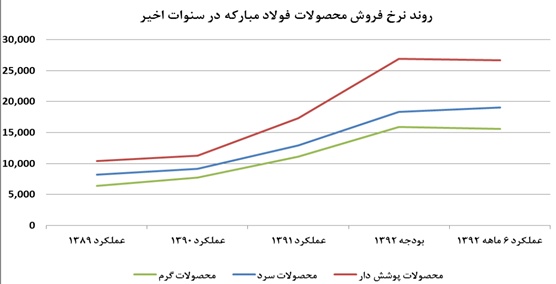 نرخ فروش محصولات شرکت در سنوات اخیر رو به افزایش بوده است. نرخ فروش محصولات گرم؛ به عنوان محصول اصلی شرکت؛ در سال 1389، 6.4 میلیون ریال به ازای هر تن بوده و طی عملکرد 6 ماهه نخست سال جاری به 15.6 میلیون ریال رسیده است. این رقم در بودجه 1392، 15.9 میلیون ریال به ازای هر تن در نظر گرفته شده است. نمودار زیر روند نرخ فروش شرکت در سنوات گذشته و بودجه سال جاری را به تفکیک محصولات نشان می دهد:
