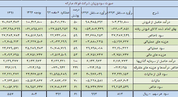 دربرآورد درآمد حاصل از سرمایه گذاری ها در سال 92 با توجه به برگزاری مجمع شرکت های بورسی پرتفو تنها 2000 میلیارد ریال سود از محل سرمایه گذاری در شرکت فولاد هرمزگان به رقم بودجه افزوده شده است. درآمد حاصل از سرمایه گذاری ها در سال 93 با توجه به برآورد های مستقل صورت گرفته از سود سال 92 شرکت های سرمایه پذیر پیش بینی شده است. همچنین سود دریافتی از فولاد هرمزگان همان 2000 میلیارد ریال درنظر گرفته شده است. شایان ذکر است که فولاد هرمزگان در شش ماهه ابتدایی سال 92، 1150 میلیارد ریال سود خالص داشته است. با عنایت به مبانی و مفروضات فوق سود خالص شرکت برای سال 1392، معادل 36.463 میلیارد ریال (1.013 ریال به ازای هر سهم) و سود سال 93، معادل 30.568 ( 849 ریال به ازای هر سهم) برآورد می گردد ذکر این نکته ضروری است که شرکت مصوبه مجلس در خصوص حق انتفاع پروانه بهره برداری از معادن را در بودجه خود لحاظ ننموده است. در صورتی که این مورد در محاسبات درنظر گرفته شود، تقریباً 90 ریال از سود هر سهم شرکت کاسته خواهدشد.