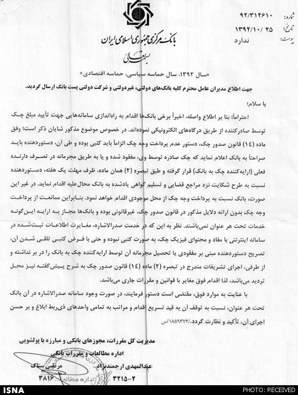 بانک مرکزی بخشنامهای به بانکها ابلاغ کرده که براساس آن بانکهایی که دارای سامانهیی برای استعلام دستور پرداخت مبلغ چک از سوی صادرکننده چک هستند باید نسبت به توقف فعالیت این سامانه اقدام کنند.