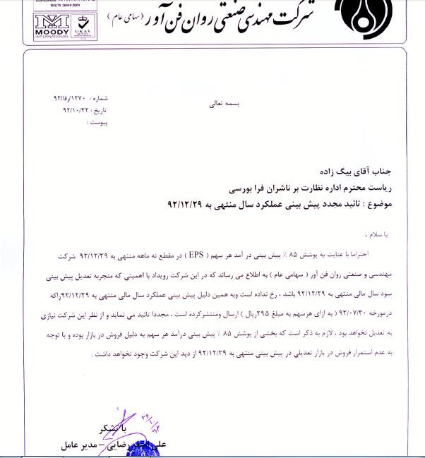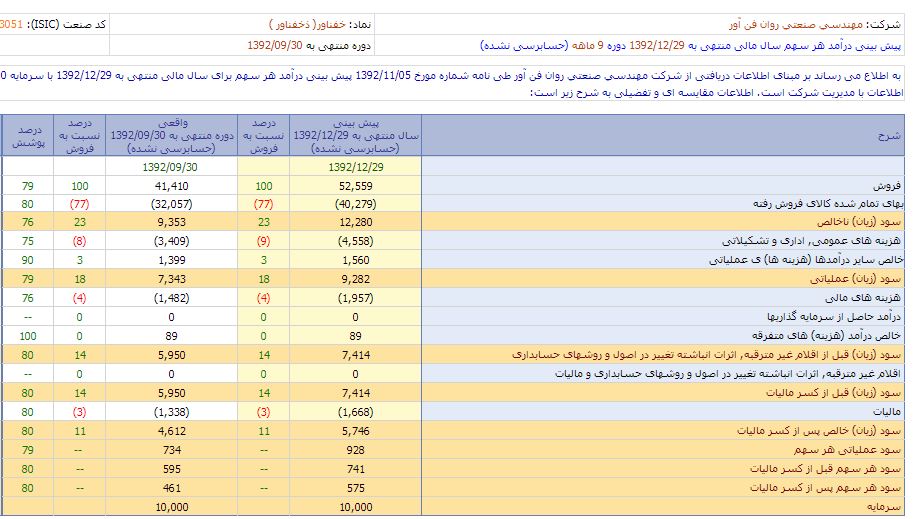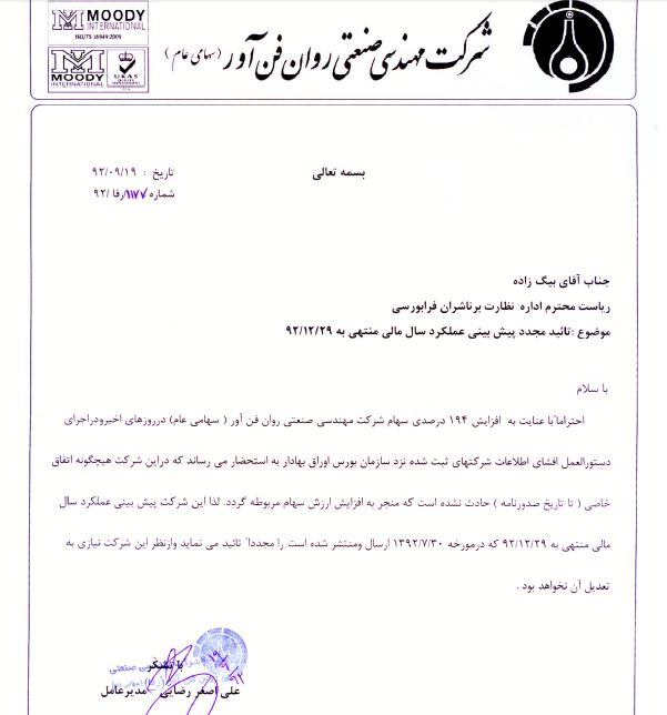 شرکت مهندسی صنعتی روان فن آور در تاریخ 92.9.19 در راستای اجرای دستورالعمل افشای اطلاعات شرکت ها اقدام به انتشار گزارش شفاف سازی مبنی بر نبود هرگونه اطلاعات با اهمیت اثرگذار بر رشد قیمت سهم کرد و مدیر عامل این مجموعه دوباره بر پایدار بودن پیش بینی های قبلی بودجه سال مالی 92 تأکید داشت. به گونه ای که طی این نامه شفاف سازی، مدیر عامل "خفناور" مدعی شد که از نظر شرکت نیازی به تعدیل سود هر سهم وجود ندارد. این اطلاعیه زمانی انتشار یافت که از تاریخ 28 آبان ماه تا زمان انتشار شفاف سازی مذکور، قیمت سهم با رشد بیش از 94 درصدی در مدت 20 روز از 3407 به 6617 ریال افزایش یافت. پس از آن شرکت در تاریخ 92.10.22 با اعلام گزارش عملکرد 9 ماهه حسابرسی نشده سال مالی 92 و پوشش 85 درصدی درآمد هر سهم در آن مقطع زمانی، مجدد بر عدم رخداد رویداد با اهمیتی که بتواند به تعدیل پیش بینی بودجه سال مالی جاری شود، تأکید کرد. در آن تاریخ نیز قیمت سهم با ادامه روند مثبت خود به 8540 ریال افزایش رسیده بود.