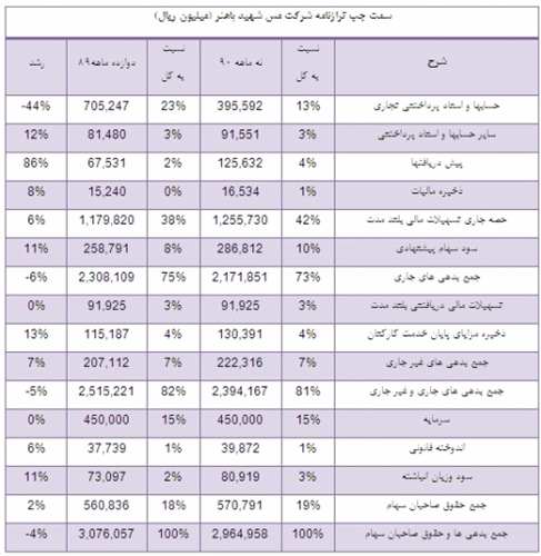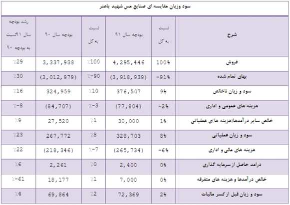 جدول فوق سود و زيان شرکت صنايع مس شهید باهنر را در دو دوره 9 ماهه سال مالی 90 و 89 مقايسه کرده و درصد پوشش بودجه سال 90 را در 9 ماهه ابتداي سال 90 مورد بررسي قرار مي دهد.