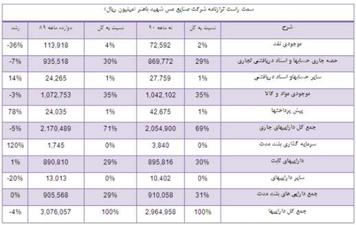 ترکيب داراييها در 9 ماهه سال 1390 شامل 69 درصد دارايي هاي جاري و 31 درصد دارايي هاي بلند مدت است.