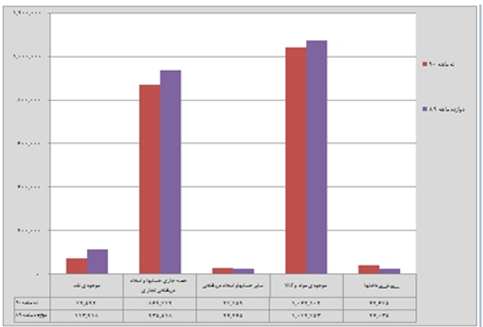 نمودار فوق سمت راست ترازنامه شرکت را در دو دوره 9 سال 1390 و 12 ماهه 89 مقايسه مي کند که مي توان نتايج ذيل را استنتاج کرد.