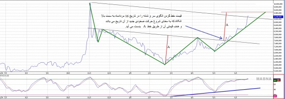 قیمت خط گردن الگوی سر و شانه را در تاریخ 16 مرداد به سمت بالا شکانده و به این معنا است که حرکت صعودی جدیدی از این پس شکل خواهد گرفت. همانطور که در شکل بالا نیز مشخص است، حذف قیمتی آن از طریق خط A به دست می آید. این نمودارها حکایت از آن دارد که بهای سکه طلا در موج سوم صعودی خود به سر می برد.