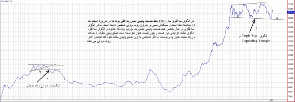 وی در تحلیل نمودارهای حرکتی شاخص کل تصریح کرد: در الگوی سه قلوی سال 1383 خط حمایت پایینی بصورت افقی بوده که در تاریخ 4 اسفند ماه 83 شکسته شده است و سیگنالی مبنی بر شروع روند نزولی شاخص داشته است اما در الگوی سه قلوی فعلی، خط حمایت پایینی به صورت مورب بوده که علاوه بر الگوی سه قلو، الگوی مثلث افزایشی نیز تشکیل داده و چون شاخص کل هنوز نتوانسته است ضلع پایین این مثلث را بشکند، روند مثبت هنوز پابرجاست اما اگر شاخص به زیر ضلع پایینی مثلث نفوذ کند، احتمال آغاز روند نزولی وجود دارد.
