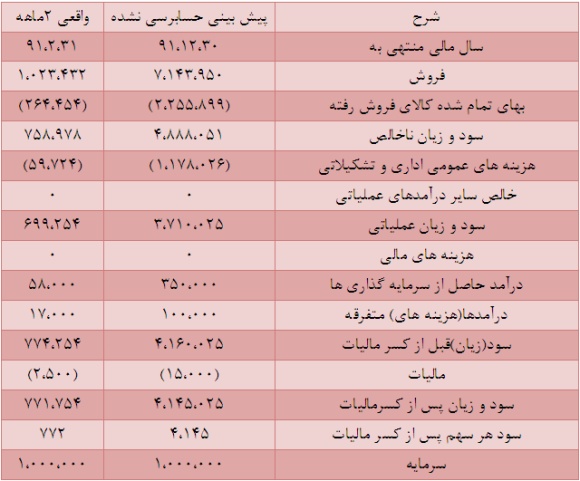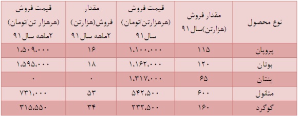 بررسی میزان تولید و فروش شرکت طی سال 91 و عملکرد واقعی 2 ماهه: