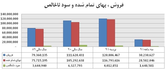 1- درآمد فروش شرکت در سال مالی 90 با 41 درصد رشد نسبت به سال مالی 89 به میزان 111.620 میلیارد ریال گزارش شده است. از طرفی درآمد فروش در بودجه 91 با رشد 8 درصدی نسبت به سال مالی 90 به میزان 120.806 میلیارد ریال برآورد شده است. در گزارش 3 ماهه نیز شرکت 25 درصد درآمد فروش را پوشش داده است.