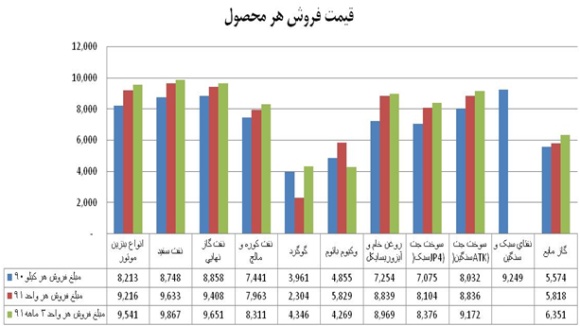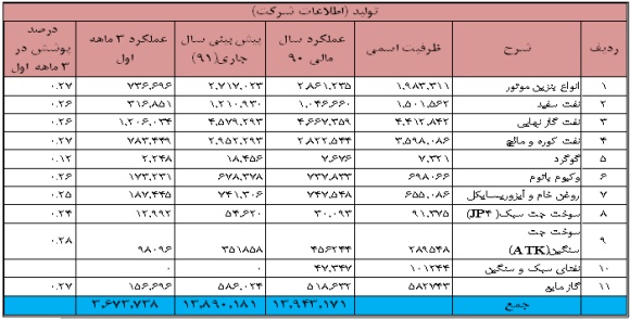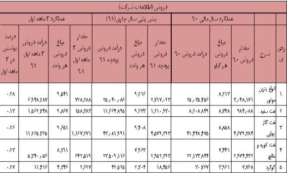 1-1- شرکت تولید کننده 11 نوع محصول است که در جدول زیر مقدار تولید، فروش، مبلغ فروش هر واحد و درآمد فروش هر یک از محصولات شرکت در بودجه 91 و سال مالی 90 و 3 ماهه اول 91 و درصد پوشش 3 ماهه 91 نسبت به بودجه 91 ملاحظه می شود: