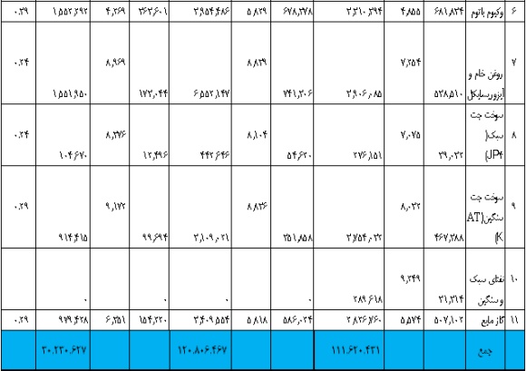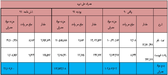 1-2- مواد مصرفی شرکت شامل 2 ماده نفت خام و پلات فورمیت است که مقدار و مبلغ آنها در جدول زیر مشخص است. شایان ذکر است که کل مواد مصرفی از داخل کشور تامین می شود.