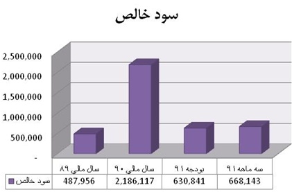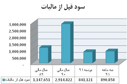 2- سود قبل از کسر مالیات در سال مالی 90 با افزودن خالص درآمدهای متفرقه به میزان 190 میلیارد ریال با 154درصد افزایش نسبت به سال مالی 89 به میزان 2.915 میلیارد ریال گزارش شده است. در بودجه 91 این رقم به 841 میلیارد ریال رسیده است.