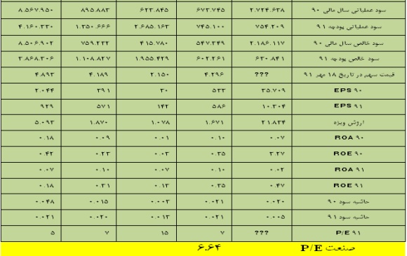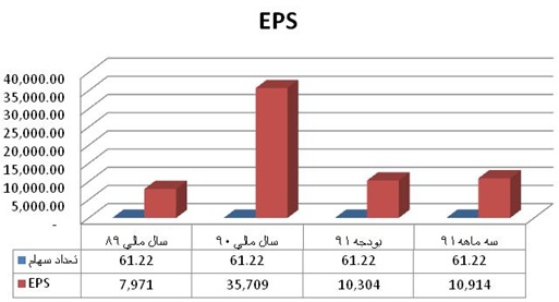 4- با تقسیم سود خالص بر تعداد سهام: در سال مالی 90 عایدی هر سهم 35.709 ریال محقق و در بودجه 91 این آیتم به شکلی کاملاً محافظه کارانه و البته عجیب 10.304 ریال برآورد شده است. چرا که در 3 ماهه نخست شرکت موفق به تحقق 106 درصدی EPS بودجه شده است.