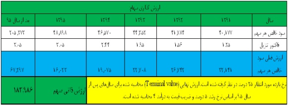 اما در صورتیکه بخواهیم ارزش ذاتی را بر اساس روش تنزیل جریانات وجه نقد محاسبه کنیم و درآمد فروش را هم راستا با درآمد فروش 3 ماهه در نظر گرفته و بر اساس نرخ رشد گذشته شرکت آنرا رشد دهیم آنگاه ارزش ذاتی شرکت بسیار متفاوت بوده و به شکل جدول زیر خواهد بود.
