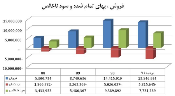 1-درآمد فروش شركت در سال مالي 90 با 64 درصد رشد نسبت به سال مالي 89، عملكرد بسيار خوبي در اولين سال حضور خود در بورس از خود به جاي گذاشت. البته در بودجه 91 درآمد فروش با 6 درصد كاهش پيش بيني شده است. بهاي تمام شده كالاي فروش رفته در سال مالي 90 با 54 درصد رشد نسبت به سال مالي 89 و در بودجه 91 با 16 درصد رشد نسبت به سال مالي 90 گزارش شده است. در نتيجه سود ناخالص با رشد خيره كننده 71 درصدي در سال مالي 90 نسبت به سال مالي 89 مواجه شده است. ليكن در بودجه 91 اين آيتم با افت 18 درصدي نسبت به سال مالي 90 برآورد شده است.