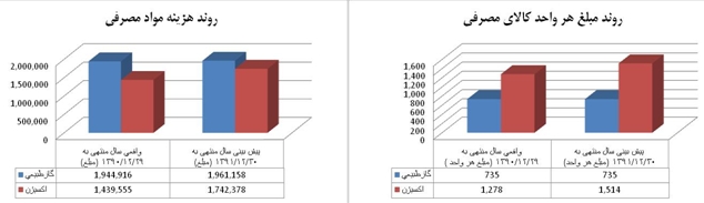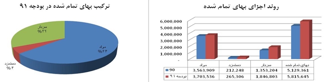 5-1- تركيب بهاي تمام شده شركت حاكي از آن است كه 64 درصد بهاي تمام شده را هزينه مواد ، 32 درصد سربار و 4 در صد را دستمزد تشكيل داده است. ضمن اينكه در بررسي روند اجزاي بهاي تمام شده شركت متوجه رشد 4 درصدي هزينه مواد، رشد 36 درصدي سربار و رشد 25 درصدي دستمزد مي شويم.