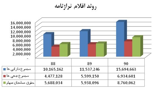 3-روند اقلام ترازنامه حاكي از رشد 36 درصدي مجموع دارايي ها، رشد 24 درصدي مجموع بدهي ها و رشد 47 درصدي حقوق صاحبان سهام در سال مالي 90 نسبت به سال مالي 89 مي باشد. بررسي تركيب حقوق صاحبان سهام نيز حكايت از رشد 43 درصدي سود انباشته در سال مالي 90 نسبت به سال مالي 89 دارد.
